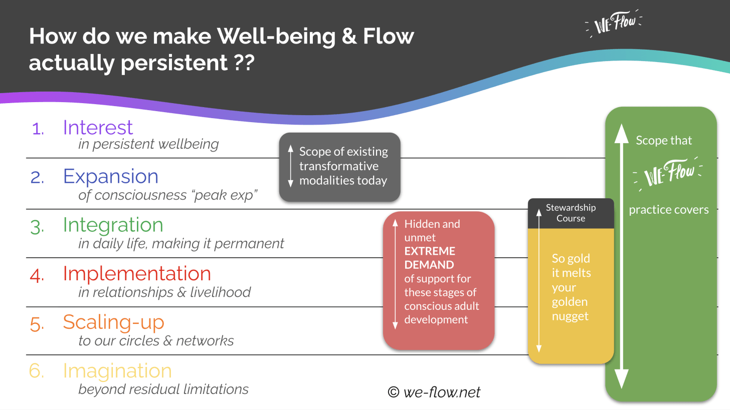First: reversal of the usual model. Most systems aim for peak experience first and hope integration follows. We-Flow inverts this: daily integration and real-time support create conditions where peak experiences emerge naturally, and then stabilize.